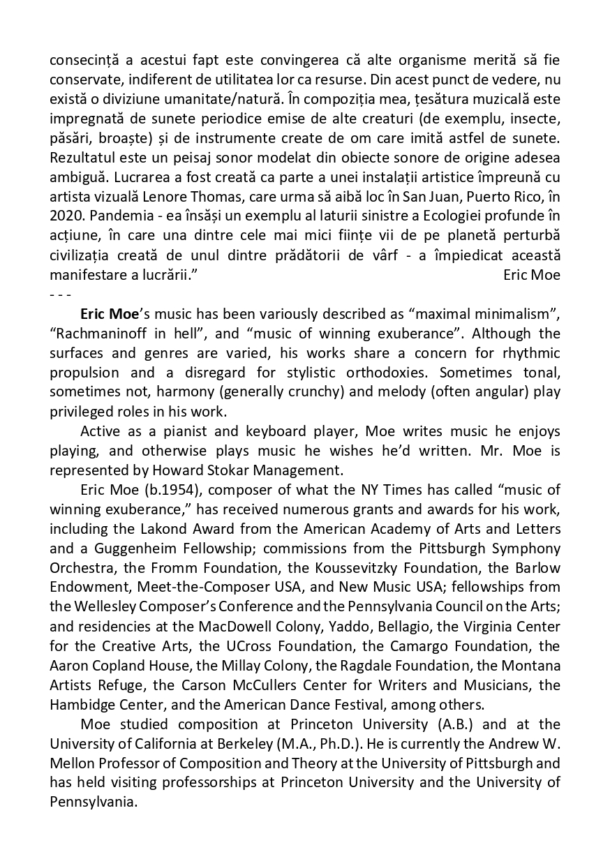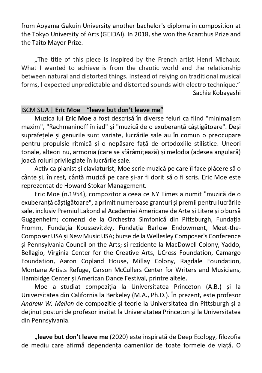 – Musicological conferences in Bucharest and online paying homage to leading Romanian and international composers by Valentina Sandu-Dediu, Olguța Lupu, Bianca Țiplea-Temeș, Petruța Măniuț, Octavia Dinulescu, Matthias Kranebitter, Oliver Sascha Frick.