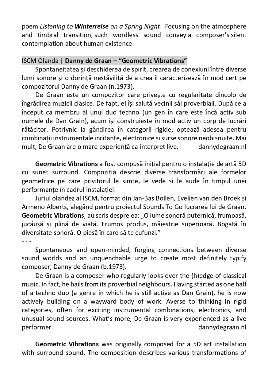 Partners: National University of Music in Bucharest, Goethe-Institut Bucharest, Art&Co Association, Sound Borders Association, Art Music Denmark, Artivistas, Ministry of Culture in Greece, ARFA, CCRMA (Center for Computer Research in Music and Acoustics – USA), National Academy of Music “Gheorghe Dima” in Cluj-Napoca, The “Ion Vidu” Art High School in Timișoara, the “Oltenia” Philharmonic in Craiova, the Pitești Philharmonic, the “Paul Constantinescu” Philharmonic in Ploiești, the “George Enescu” National University of Art in Iași, the “Jean Constantin” Multifunctional Educational Centre for Youth in Constanța and the “Teodor T. Burada” in Constanta, Pastila Roz, Norsk jazzforum, Music Norway.